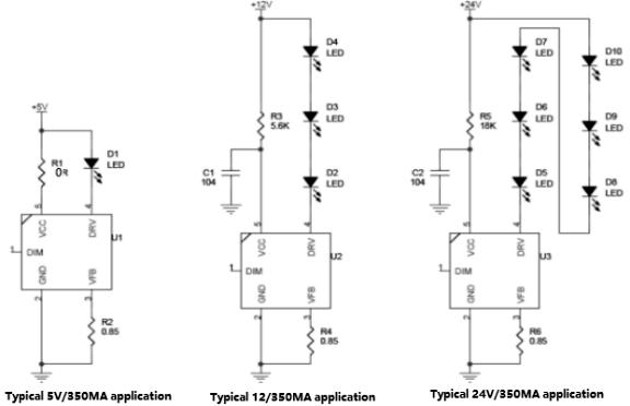 例如:DC12V輸入,負(fù)載Vled 3V 350MA三燈串聯(lián),在常溫下工作,輸入電壓大于9.5V,LED工作電流穩(wěn)定,當(dāng)輸入電壓低于9V,LED電流下降,如果輸入電壓不足以提供DRV啟動電壓及LED正向電壓,LED電流會減少。