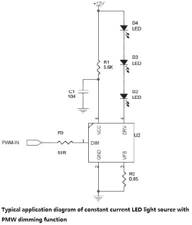 HX304提供了輸出端使能控制引腳DIM,內(nèi)部具有上拉電阻,在不需要使用使能引腳的情況下,該引腳懸空,默認(rèn)輸出恒流。用戶也可以采用5V邏輯通過該引腳對輸出電流進(jìn)行調(diào)光控制,實(shí)現(xiàn)高質(zhì)量的PWM調(diào)光,與HX304配合使用作為大功率恒流驅(qū)動器。