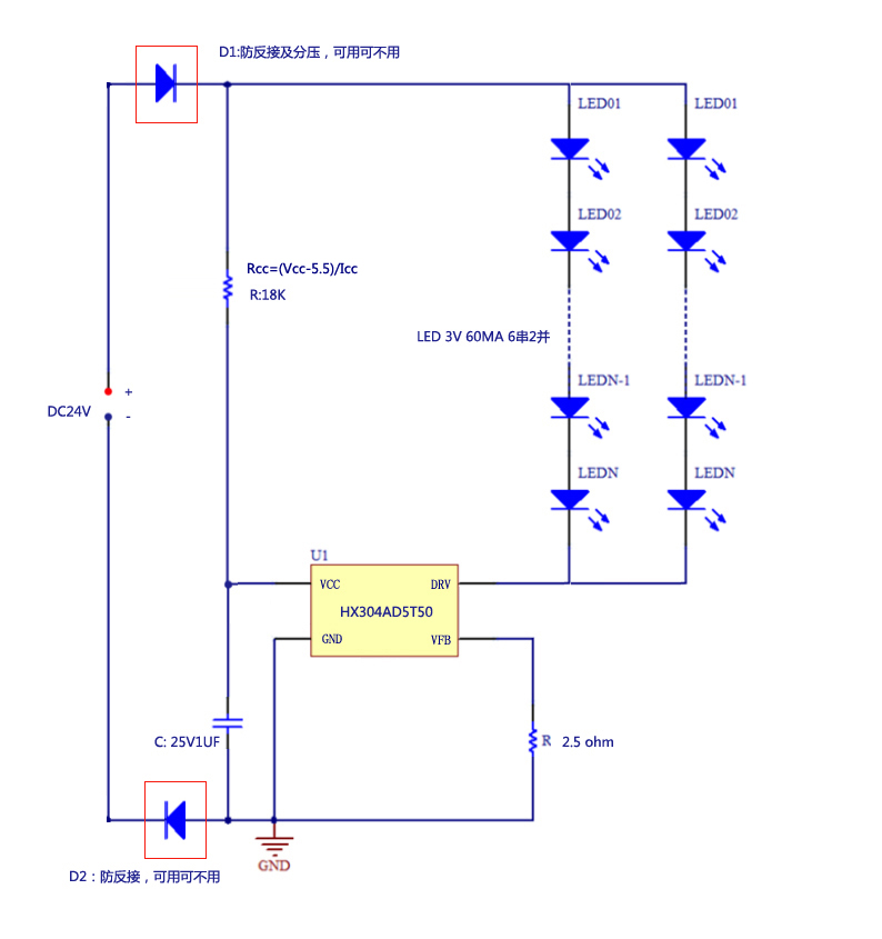 HX304外圍元件少,應(yīng)用可靠性好,芯片內(nèi)部包含高精度的帶隙基準(zhǔn)源,5.5V電壓調(diào)整器,過溫保護電路和低壓差驅(qū)動電路等。