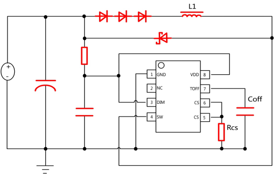 LED輸出電流由電流采樣RCS以及TOFF等參數(shù)設(shè)定:
