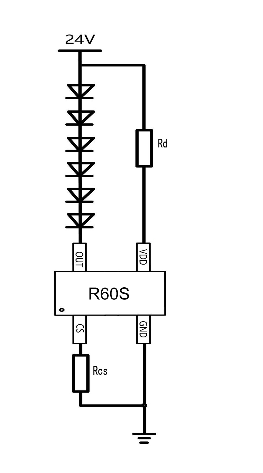 R60S是一款內(nèi)置高耐壓功率器件恒流驅(qū)動器,適用于軟燈帶、硬燈條和照明燈板等應(yīng)用的中低壓照明恒流驅(qū)動器,具有良好的抗沖擊能力和高可靠性。LED電流由連接CS腳與GND腳的電阻RCS設(shè)定,恒流精度好,LED電流也可以使用PWM調(diào)光控制。適用于恒壓電源供電,不需要額外組件,系統(tǒng)結(jié)構(gòu)簡單,外圍元件極少,方案成本低。